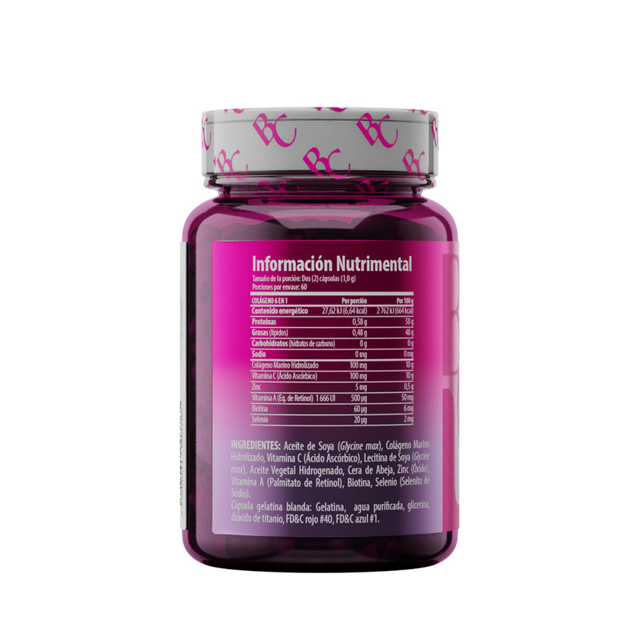 INGREDIENTES: Aceite de Soya (Glycine max), Colágeno Marino Hidrolizado, Vitamina C (Ácido Ascórbico), Lecitina de Soya (Glycine max), Aceite Vegetal Hidrogenado, Cera de Abeja, Zinc (Óxido), Vitamina A (Palmitato de Retinol), Biotina, Selenio (Selenito de Sodio). Cápsula gelatina blanda: Gelatina, agua purificada, glicerina, dióxido de titanio, FD&C rojo #40, FD&C azul #1.