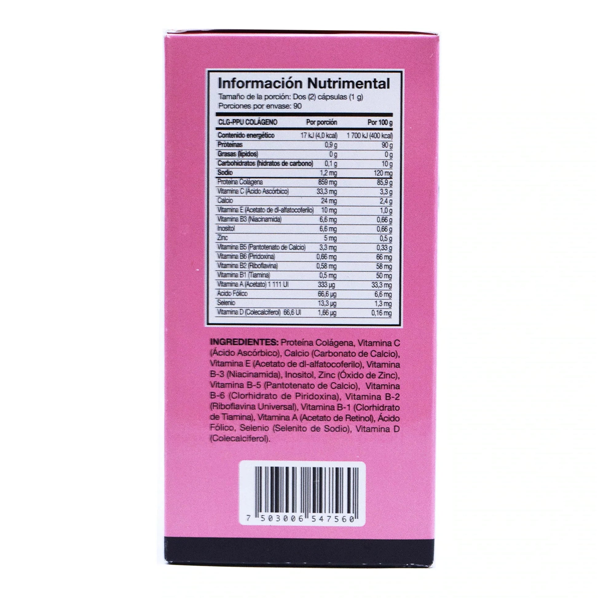 Proteína colágena, vitamina C, calcio, vitamina E, vitamina B-3, inositol, zinc y vitamina A.