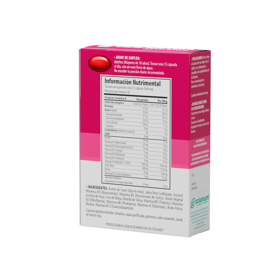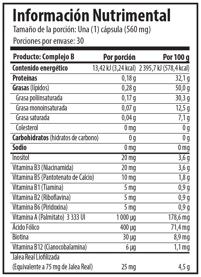 INGREDIENTES: Aceite de Soya (Glycine max), Jalea Real Liofilizada, Inositol Vitamina B3 (Niacinamida), Vitamina B5 (Pantotenato de Calcio), Aceite Vegetal Lecitina de Soya, Cera de Abeja, Dióxido de Silicio, Vitamina B1 (Tiamina), Vitamina B2 (Riboflavina), Vitamina B6 (Piridoxina), Vitamina A (Palmitato), Ácido Fólico, Biotina, Vitamina B12 (Cianocobalamina). Cápsula gelatina blanda: Gelatina, agua purificada, glicerina, color caramelo, óxido de hierro rojo.