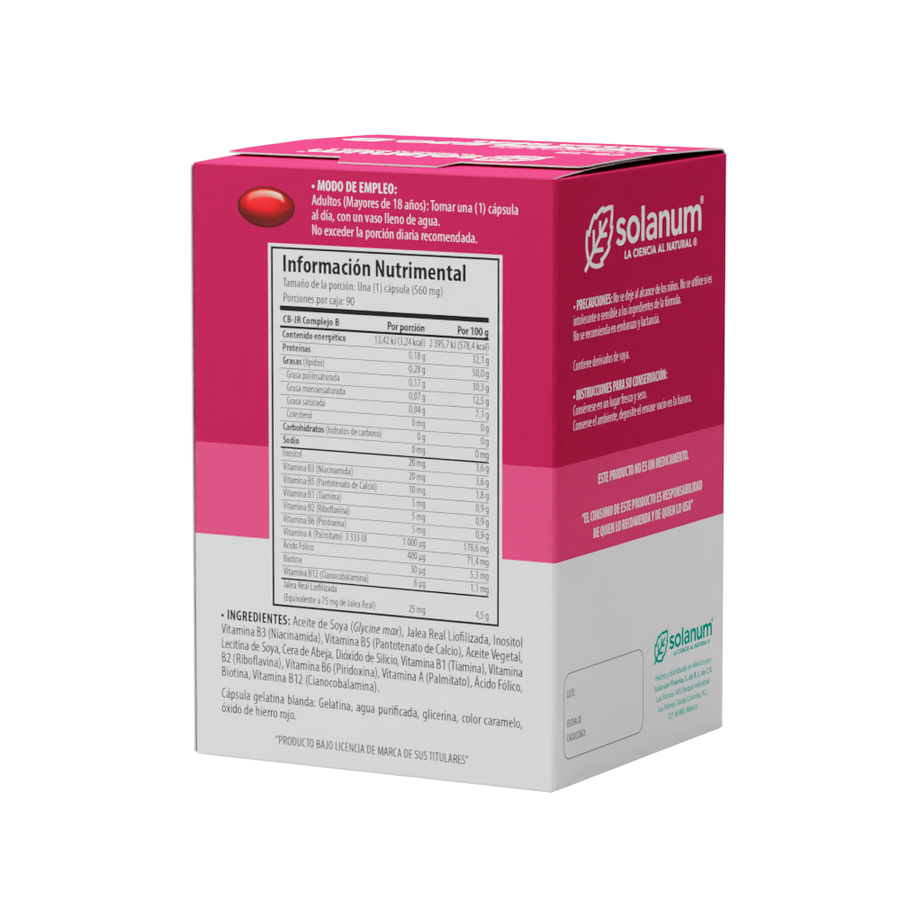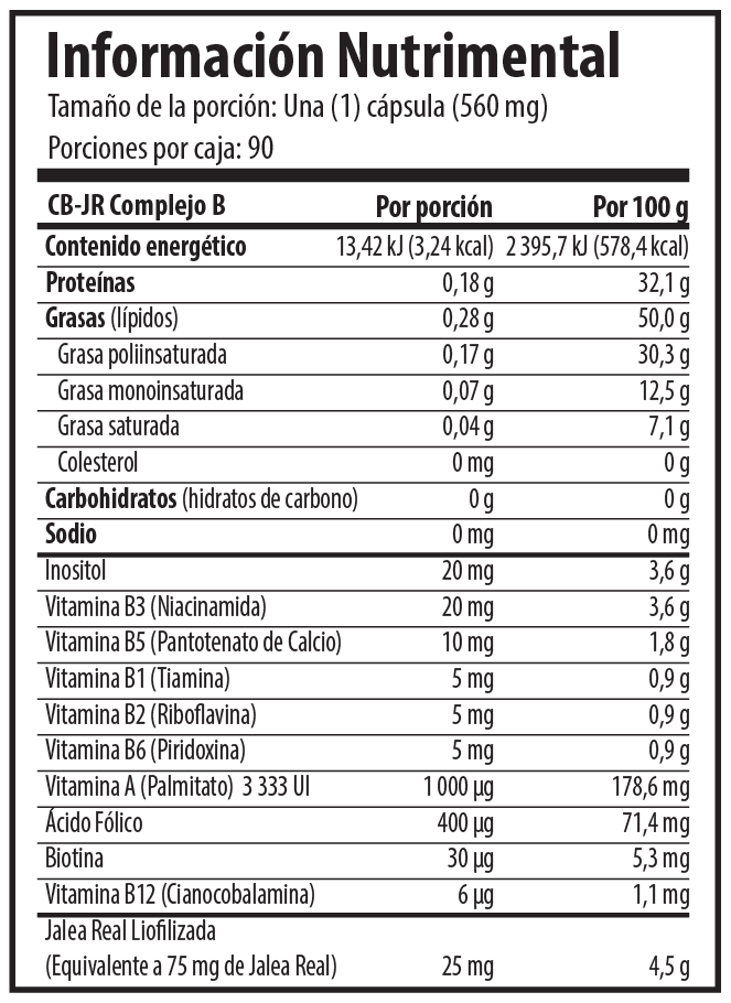 INGREDIENTES: Aceite de Soya (Glycine max), Jalea Real Liofilizada, Inositol Vitamina B3 (Niacinamida), Vitamina B5 (Pantotenato de Calcio), Aceite Vegetal, Lecitina de Soya, Cera de Abeja, Dióxido de Silicio, Vitamina B1 (Tiamina), Vitamina B2 (Riboflavina), Vitamina B6 (Piridoxina), Vitamina A (Palmitato), Ácido Fólico, Biotina, Vitamina B12 (Cianocobalamina). Cápsula gelatina blanda: Gelatina, agua purificada, glicerina, color caramelo, óxido de hierro rojo.