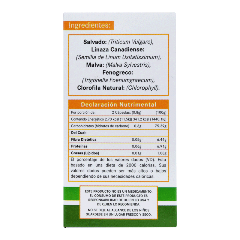 Salvado de trigo, Linaza, Fenogreco, Malva, Clorofila, Tlanchalagua y Cuachalalate.