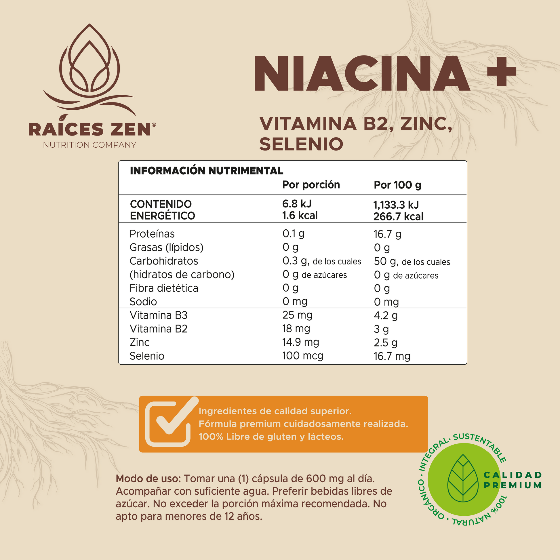 Niacina, Vitamina B2, Zinc y Selenio Raíces Zen Super Premium 120 Cápsulas