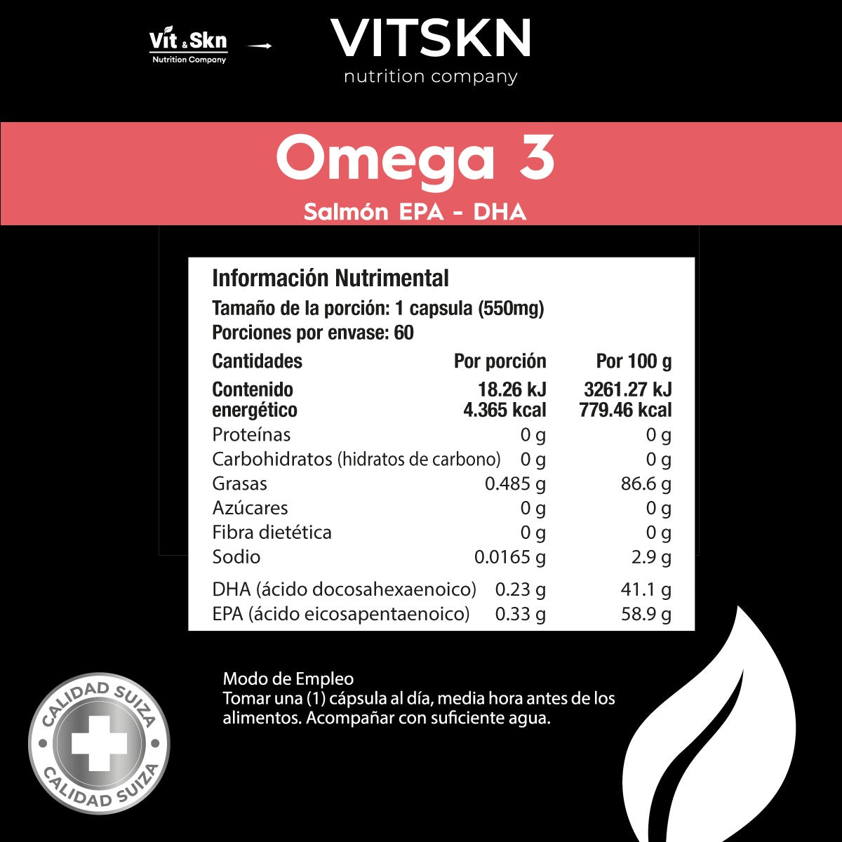 Skin Vit Nutrition Company - Super Premium Health presenta Omega 3 de Salmon en un formato de 60 Cápsulas.
