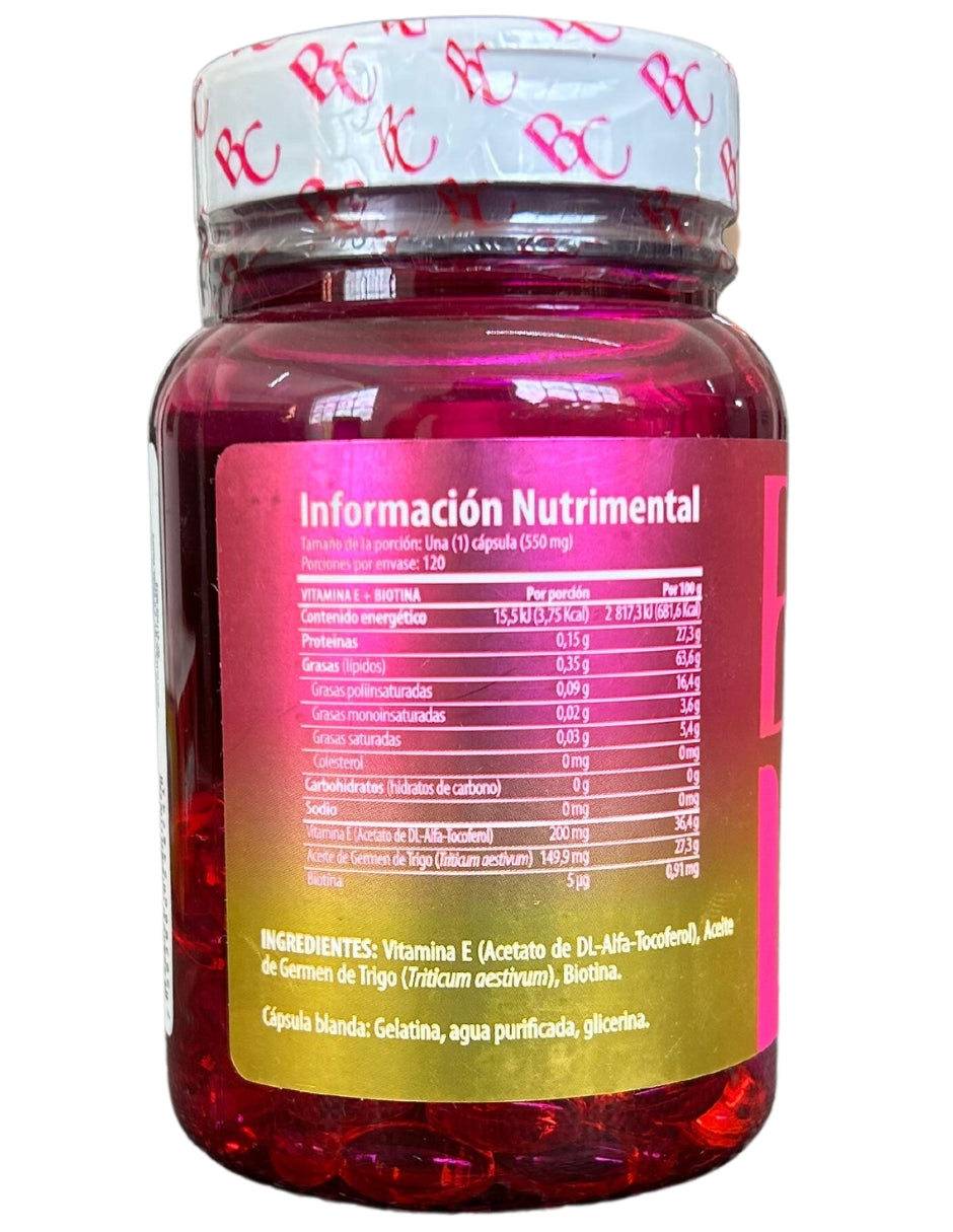 INGREDIENTES: Vitamina E (Acetato de DL-Alfa-Tocoferol), Aceite de Germen de Trigo (Triticum aestivum), Biotina. Cápsula blanda: Gelatina, agua purificada, glicerina.