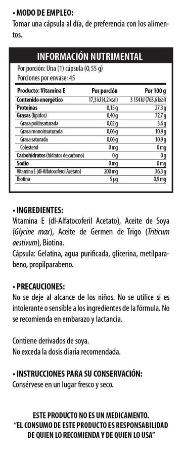 INGREDIENTES: Vitamina E (dl-Alfatocoferil Acetato), Aceite de Soya (Glycine max), Aceite de Germen de Trigo (Triticum aestivum), Biotina. Cápsula: Gelatina, agua purificada, glicerina, metilparabeno, propilparabeno.